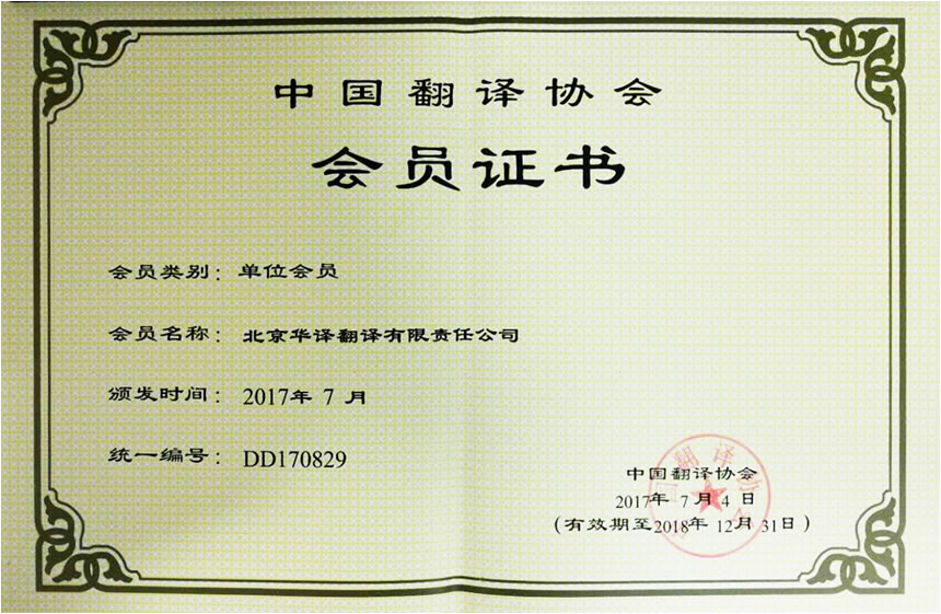北京華譯翻譯有限責任公司是中國翻譯協會(TAC)會員, 中國翻譯協會成立于1982年,是由與翻譯及與翻譯工作相關的企事業單位、社會團體及個人自愿結成的性、行業性、非營利社會組織,是翻譯領域的性社會團體。
