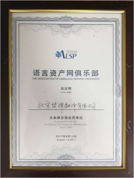 北京華譯翻譯有限責任公司是語言資產網俱樂部(ALSP)會員,語言資產網俱樂部,是由瑞科翻譯公司、志遠翻譯、Tmxmall等十家業內知名翻譯服務提供商、語言相關 IT 公司和語言技術研發企業共同發起成立的國內首家語言服務行業俱樂部,是一家匯聚產學研的公共平臺,創始單位的年產值總計超過三億元人民幣。